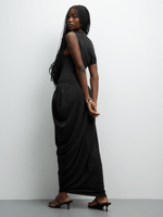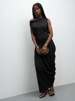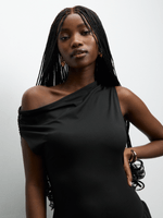 Elevate your style with our black plush knit asymmetrical draped dress. Made with polyamide fabric for ultimate comfort. Perfect for any occasion with its unique silhouette.