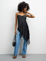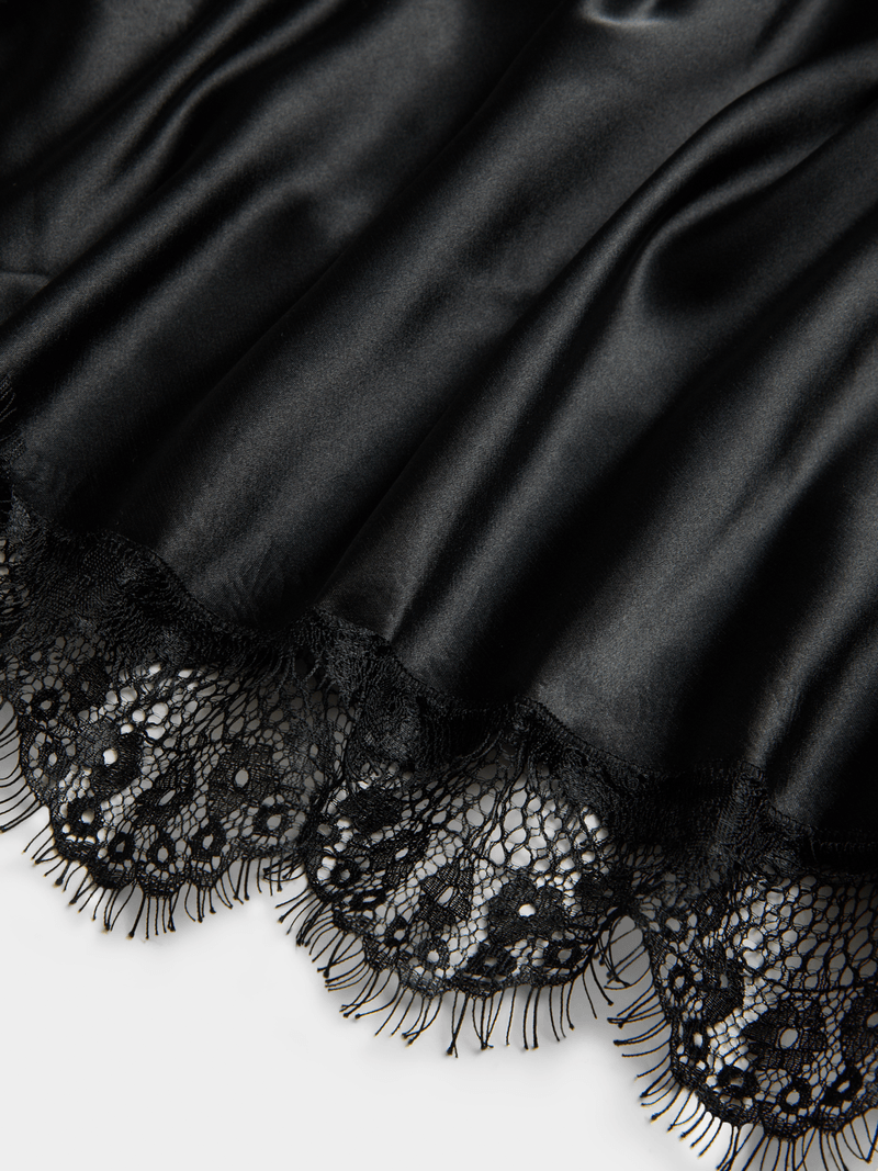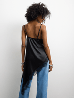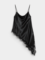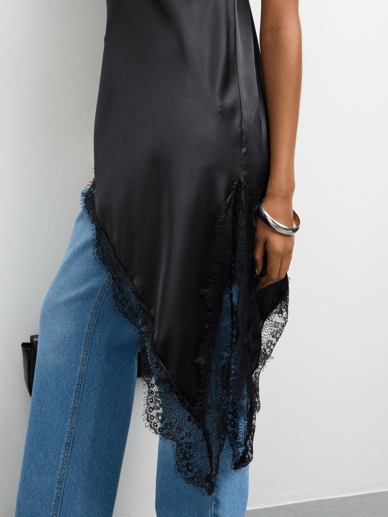 Elevate your style with our black satin cowl cami featuring delicate lace detail. This versatile piece is perfect for day or night. Made with high-quality satin and designed with a flattering cowl neckline.