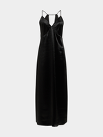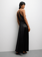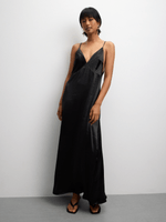 Elevate your style with our black satin maxi dress, featuring a flattering v-neckline. Crafted with smooth satin fabric for a luxurious feel. Perfect for any occasion, this dress is a must-have in your wardrobe.