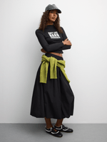Introducing our sleek black taslon bubble maxi skirt, perfect for adding a touch of elegance to your wardrobe. Made from a comfortable poly-cotton blend, this skirt features a flattering silhouette and a flowing design.