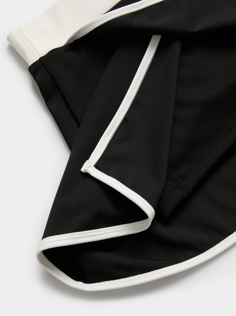 Introducing our Women's Sports Lux Wrap Skort with Piping! Stay stylish and comfortable in this black active wear piece. Made from a polyester blend. Perfect for workouts or casual outings.