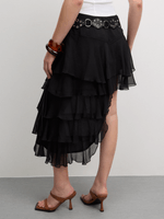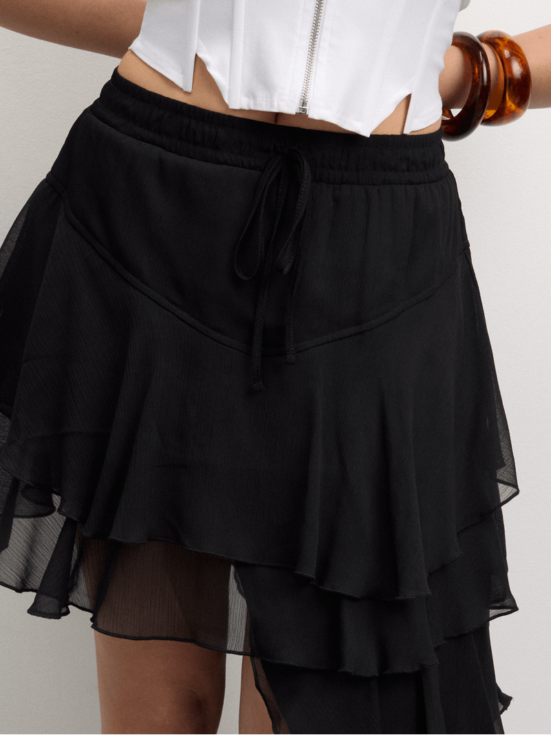 Elevate your outfit with the stylish black Yoryu chiffon asym ruffle skirt. Made from high-quality polyester fabric, this midi skirt features a unique design that adds a touch of flair to any look. With a comfortable fit and a fun ruffle detail, this skirt is a versatile addition to your wardrobe.