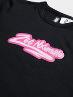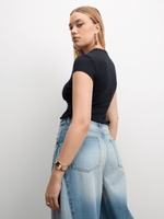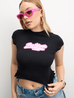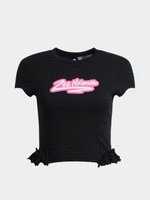 Get ready to elevate your casual look with our black Zee Nxumalo Baby Tee. Made with a soft cotton blend fabric, this tee features a stylish ruffled hem for a touch of flair.