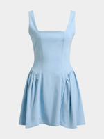Introducing our Blue Bengaline Bustle Mini Dress! Made with quality bengaline fabric, featuring a square neckline and bustle detail. This dress is perfect for any occasion.