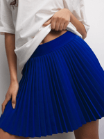 This blue mini skirt is giving full Shaakira vibes — flared, flirty, and made to move. Featuring a crepe fabric & a sexy pleated design. When you walk, the skirt talks.