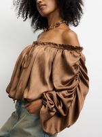 Elevate your style with our chic brown off-shoulder top featuring trendy balloon sleeves. Made from lightweight rayon for comfort. Perfect for any occasion.