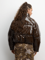 Stay warm and stylish with this glossy nylon puffer jacket in chocolate brown. Designed for comfort with a wipe-down fabric, this jacket is perfect for chilly days. Made from high-quality nylon, this jacket is versatile and easy to clean. Add a trendy touch to your wardrobe with this essential piece.
