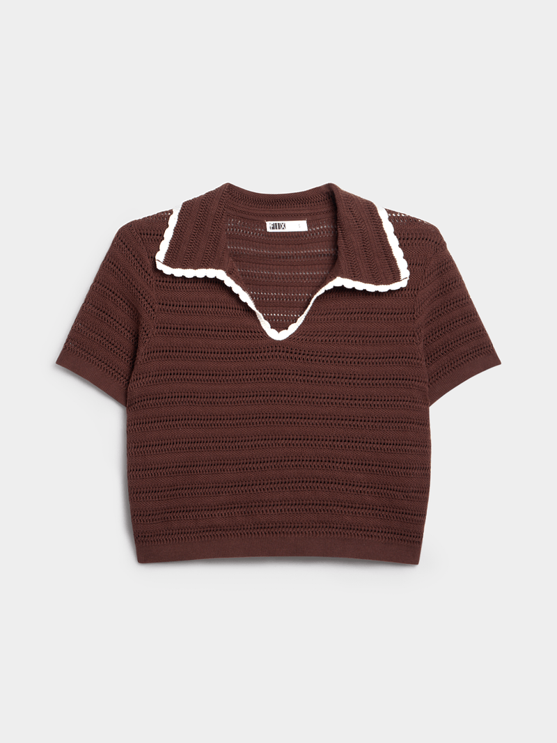 Stay effortlessly stylish in The FIX Women's Brown Knit Crochet Polo Collar Top. Made with cozy cotton, this top features a unique crochet design and a classic polo collar. Perfect for everyday wear. Reach for this chic top to elevate your casual look.
