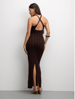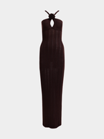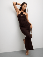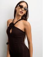 Turn heads in this elegant chocolate brown maxi dress, featuring a halter neckline with delicate rosette details. Made from soft, stretch 100% polyester knit, it hugs your curves and flows beautifully to the floor. Perfect for weddings, dinners, or any special occasion.
