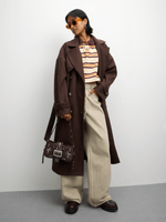 Stay warm and stylish with our women's melton double flap trench coat in chocolate brown. Made of high-quality polyester and melton, this coat is both cozy and durable. Features double-breasted buttons and a classic trench design. Perfect for any outfit!