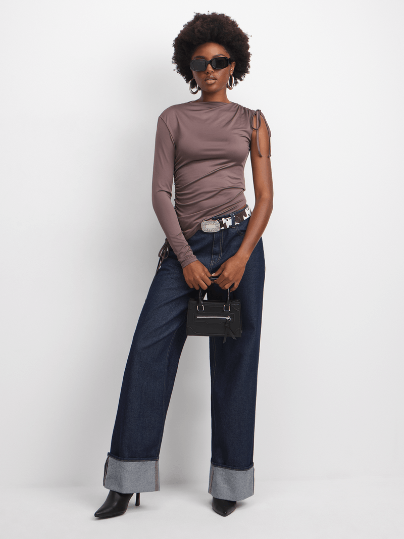 Get ready to turn heads in this one-shoulder top with side rush detailing. Made from a ITY fabric, this brown top is a versatile addition to your wardrobe. Perfect for any occasion, this top is sure to elevate your style effortlessly.
