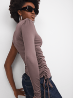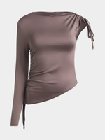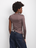 Get ready to turn heads in this one-shoulder top with side rush detailing. Made from a ITY fabric, this brown top is a versatile addition to your wardrobe. Perfect for any occasion, this top is sure to elevate your style effortlessly.
