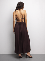 This chocolate brown maxi dress is the perfect addition to your wardrobe. Featuring a crepe fabric, fit & flare sexy open back with pleated design. Style with strappy heels or sneakers for a scorching look.