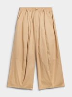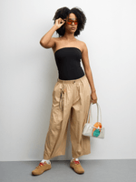 Elevate your wardrobe with our brown woven pleated barrel pants made with soft cotton twill. These stylish pants feature a flattering fit and versatile design. Perfect for any occasion.