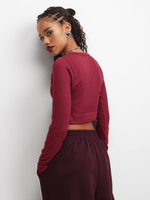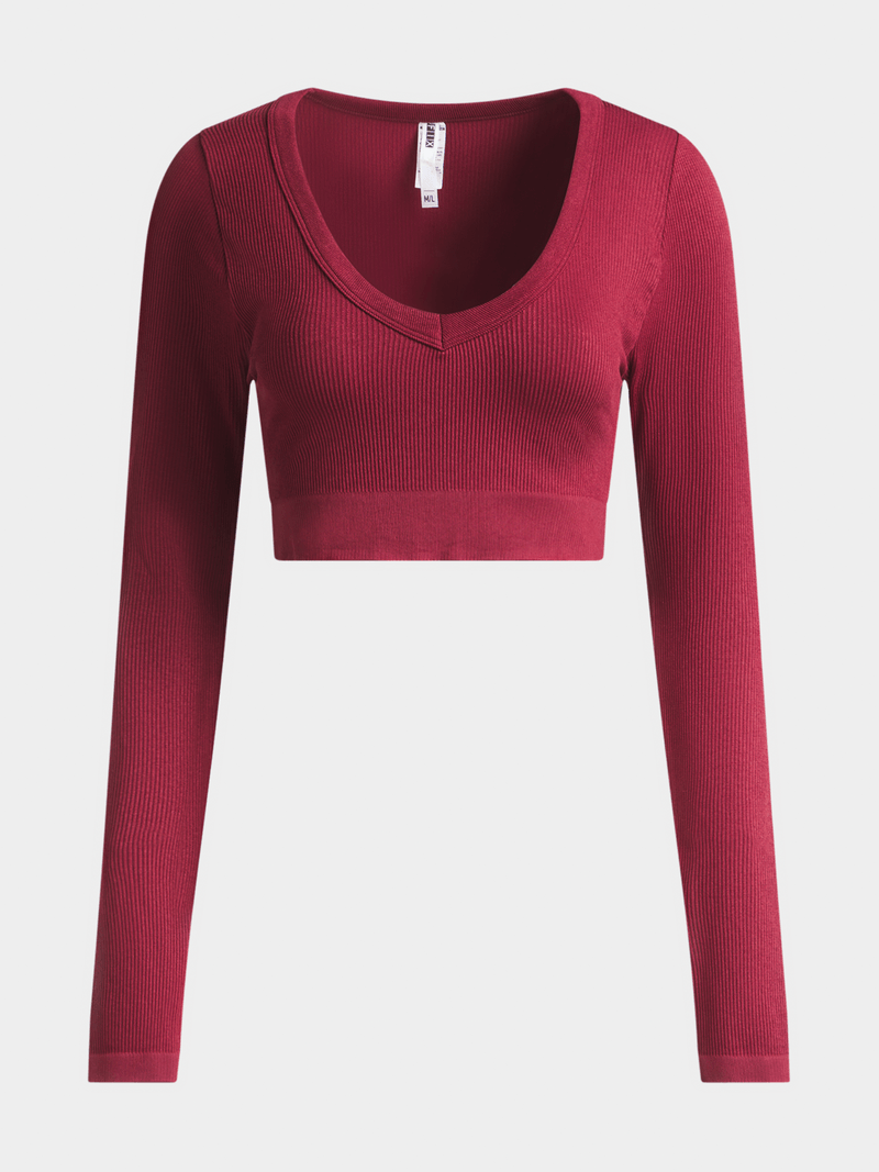 This top is everything we are loving for the upcoming season. Featuring a burgundy seamless fabric, long sleeves and crop fit. Style with a cute skirt or jeans and sneakers for a fresh finish.