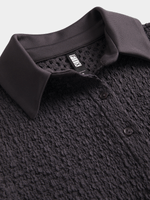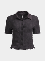 This shirt brings all the drama! Featuring a crepe fabric, fitted with a fril at the hem, short sleeves and button down design. This shirt's got that extra touch to turn basic into baddie.