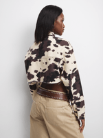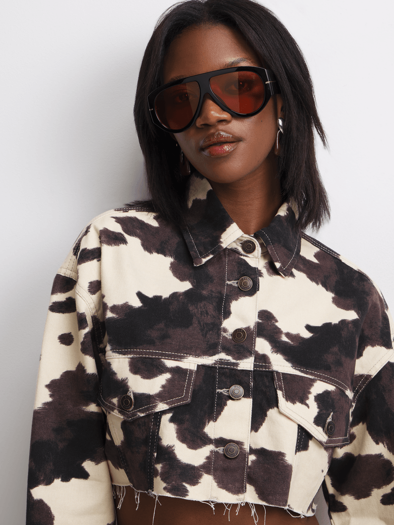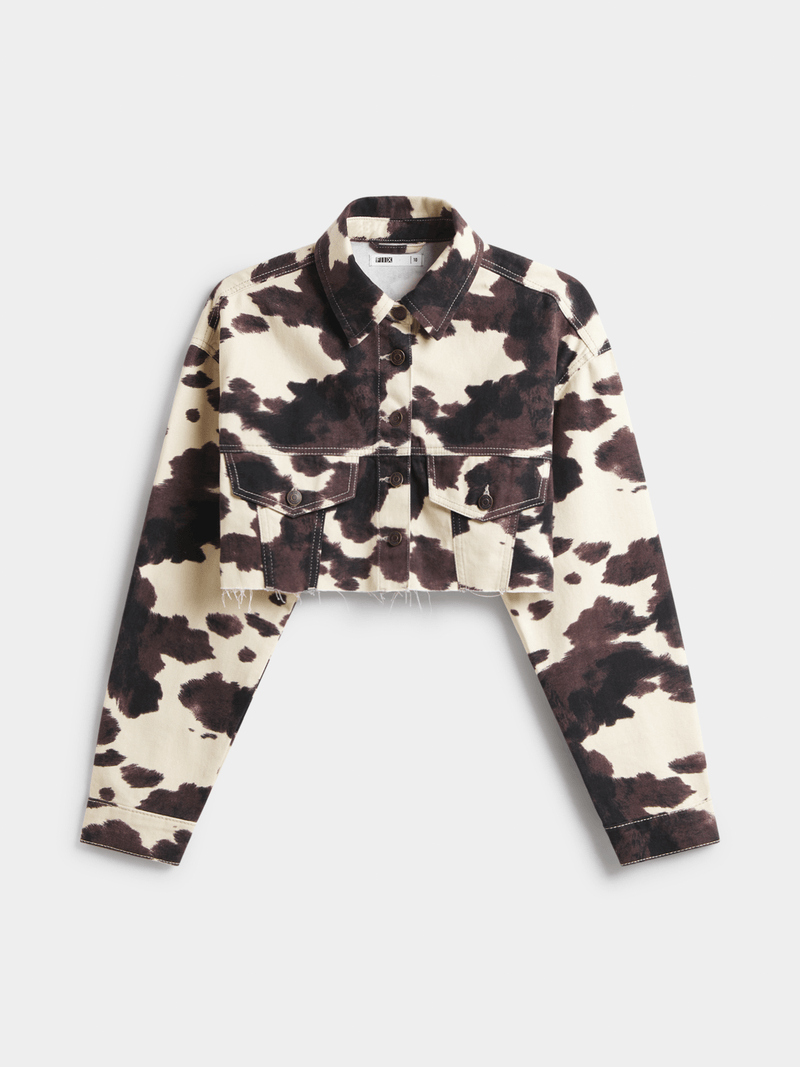 Get ready to turn heads in this brown cow print cropped denim jacket. Made with denim fabric, this jacket features a unique cow print design. Perfect for adding some fun and style to your wardrobe.