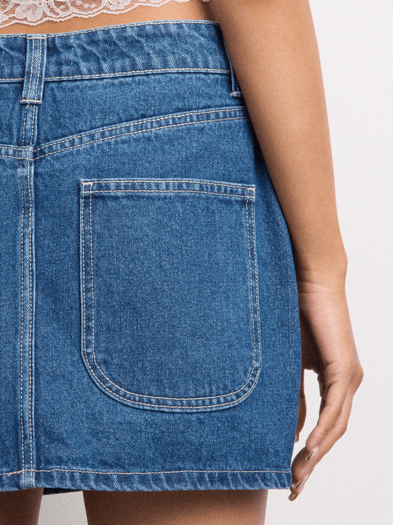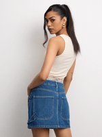 Featuring a dark wash denim fabric and carpendter design, this is the perfect skirt to style up or down. Pair it with a sneaker or heel and cropped shirt for a look we love!