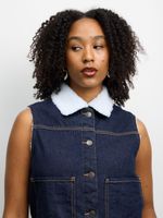 Stay cozy and stylish with our dark wash denim sleeveless borg lined jacket. Made with denim and cotton, this jacket is perfect for everyday wear. With a sleeveless design, it's versatile for layering. Upgrade your wardrobe with this trendy piece that offers comfort and style.