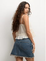 Introducing The FIX Dark Wash Frayed Denim Mini Skirt. Features a stylish frayed waistband and sand spray detailing for a trendy look. Made from high-quality denim for comfort and durability. Perfect addition to your wardrobe.