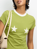 Introducing our Dirty Lime Starz Baby Tee, made from soft and stretchy cotton lycra. This tee features a crew neckline and short sleeves for a comfortable fit. Stand out in style with the fun starz print!