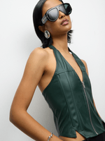 Elevate your style with our Forest Green Halterneck! Featuring a trendy zip-through design, this top is perfect for all occasions. Made of high-quality PU fabric for a luxe feel.