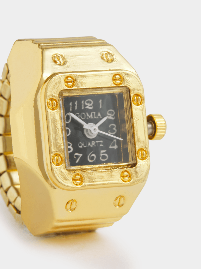 Introducing The FIX gold watch ring. This stylish accessory features a sleek metal design that complements any outfit. With a unique watch feature, this ring adds a touch of sophistication to your look.