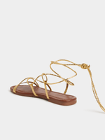 Introducing our stylish gold wrap up flat sandals! Made with high-quality PU material for comfort and durability. Easy to wear and perfect for any occasion. Step up your shoe game with these trendy sandals that elevate any outfit.