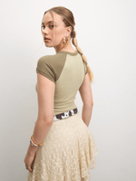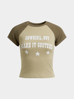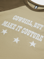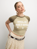 Elevate your casual style with our green cowgirl graphic top. Made from a comfortable cotton blend with a hint of Lycra for stretch, this short-sleeved tee features a crew neck. Perfect for adding a touch of fun to your everyday look.