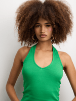 Elevate your style with our rib halterneck top in vibrant green. Made with a comfortable ribbed fabric, this top is perfect for any occasion. Designed with a trendy halterneck and sleeveless silhouette. Upgrade your wardrobe with this versatile piece.