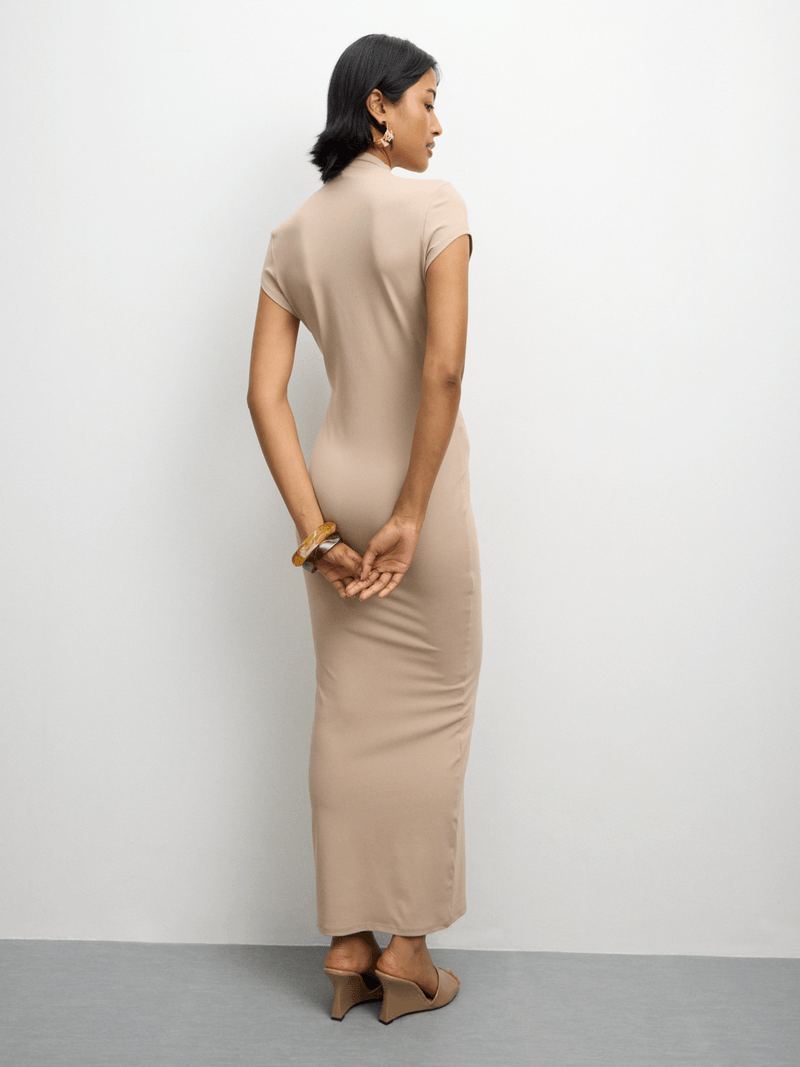 Introducing our cozy latte knit high neck maxi dress, perfect for any occasion. Made with soft polyamide fabric for ultimate comfort. Features cap sleeves and a flattering silhouette. Elevate your style effortlessly with this versatile piece. This dress is a must-have in every wardrobe.