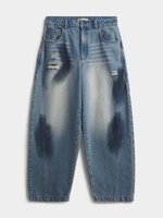 Elevate your denim game with this blue brush stroke stained jeans. Features a denim fabric & a barrel leg shape. These jeans bring all the baggy baddie vibes.—no skinnies, no drama. Just that everyday drip that hits with any crop tee or hoodie. Throw on some kicks and you are guaranteed to turn heads!