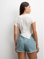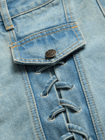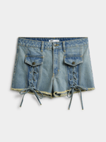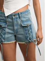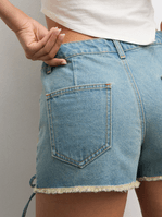 Get your summer style on point with this denim shorts. Featuring a light wash denim fabric, frayed edges and edgy lace up detail. It’s giving off-duty baddie all summer long. Pair with a baby tee, oversized shades, and some chunky kicks cause these shorts? They do damage!