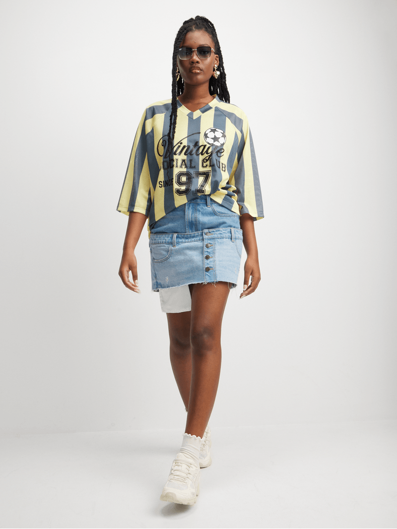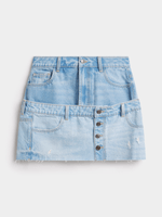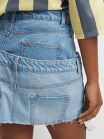Featuring a light wash denim fabric and double layer detail, this is the perfect skirt to style up or down. Pair it with a sneaker or heel and cropped shirt for a look we love!