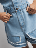 Get ready for summer with this frayed denim shortall. Featuiring a light wash denim fabric & a stylish frayed hem design. Style it with ya fave pair of sneaker and some fiyah acessories. it's a statement screamin' I'm here and I'm fierce!