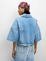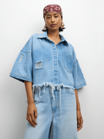 get ready to rock a cool, effortless look with our light-wash oversized denim shirt! crafted from quality denim with stylish abrasions, this shirt is perfect for any casual occasion. easy to pair with your favorite bottoms, this shirt will be a staple in your wardrobe. made for comfort and style, this shirt is a must-have!