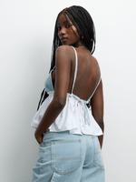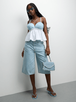Elevate your casual chic style with our light-wash denim cami. Featuring a trendy white frill hem, this piece is perfect for any occasion. Crafted from soft polyester fabric. It's a must-have addition to your wardrobe!