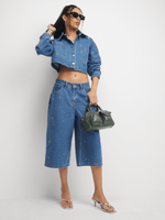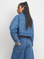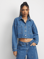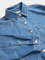 Elevate your denim collection with this fiyah jacket. Featuring a medium wash denim fabric, double pocket, eyelet detailing & cropped fit. Rock it with your fav season pieces for looks that are straight up servin'!