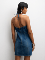 Elevate your denim game with our medium wash strappy halter dress. Featuring a trendy ripped asymmetrical hem with a flattering fit, this denim dress is a must-have for your wardrobe. Easy to care for with cool wash instructions. Designed for comfort and style.