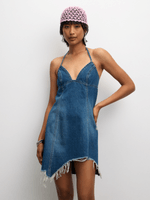 Elevate your denim game with our medium wash strappy halter dress. Featuring a trendy ripped asymmetrical hem with a flattering fit, this denim dress is a must-have for your wardrobe. Easy to care for with cool wash instructions. Designed for comfort and style.