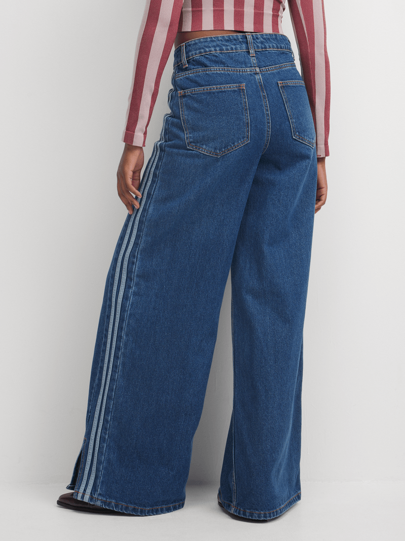 Complete your weekend look with these must-have wide leg jeans. Featuring a medium wash denim fabric, a stylish side stripe detail pockets and a wide leg fit. Rock these jeans with yo' fave top and complete the look with heels or sneakers and a shoulder bag. This denim isn’t just a bottom it’s a whole flex!