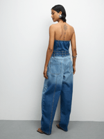 Elevate your style with our denim jumpsuit featuring a trendy bandeau top, button-thru closure, and ombre design. Made for comfort and style, this jumpsuit is perfect for any occasion.