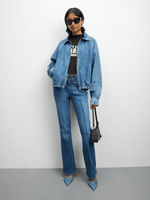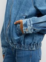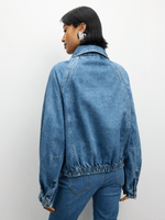 Introducing our stylish mid-wash denim bomber jacket, perfect for adding a cool twist to any outfit. Made from high-quality denim fabric, this jacket features a classic collar neckline and long sleeves.