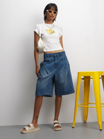 These mid wash jorts come through with pleats up front for that lowkey tailored feel. Featuring a denim fabric, longer length fit & a flattering pleated design. Throw on a crop, layer some chains, and you’re set.
