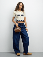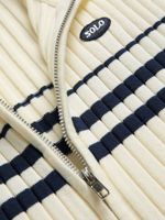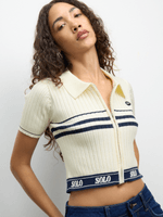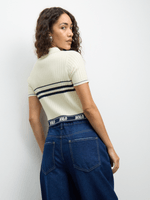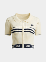 Our knit polo zipthru top in milk and navy is a must-have for your casual wardrobe. Made from a cotton blend, it's soft and comfortable for all-day wear.