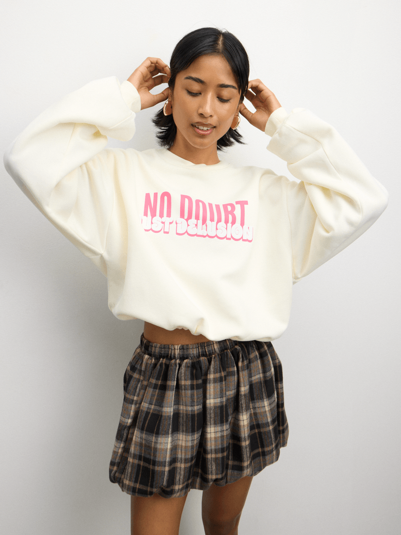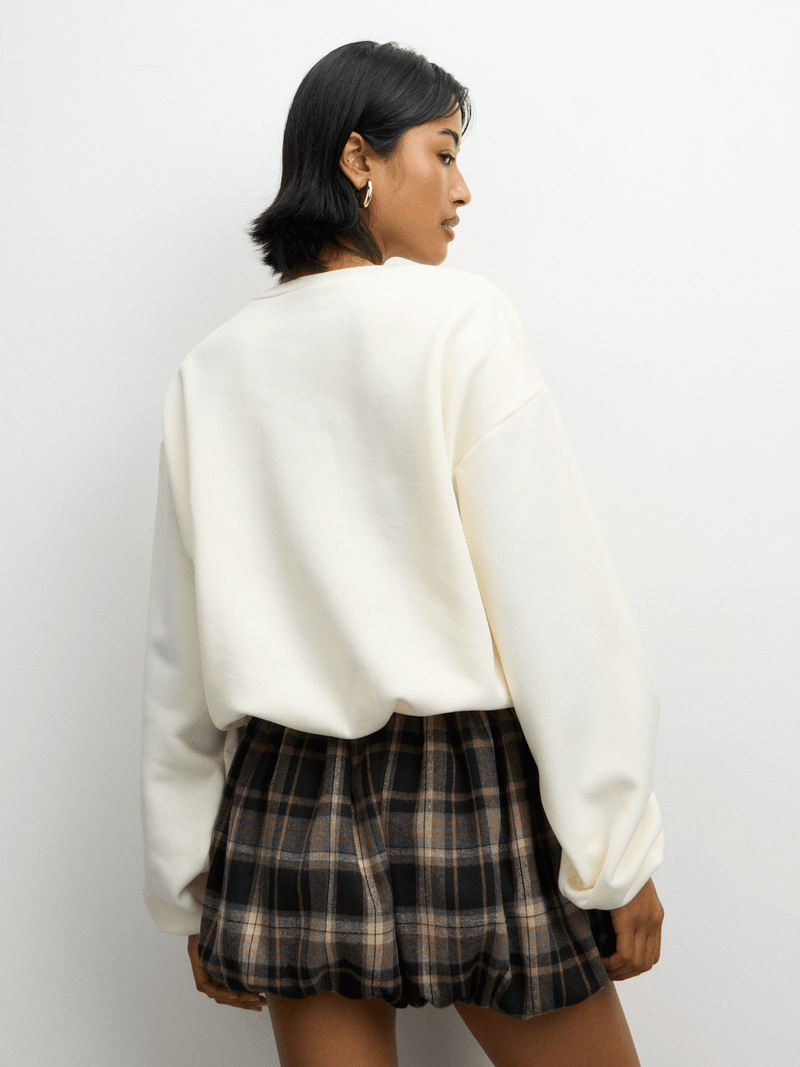 Get cozy in our milk fleece sweat top with a stylish bubble hem. This top features a brushed fleece fabric for ultimate comfort & a crew neckline with long sleeves. Perfect for adding a layer of warmth to your fit of the day.