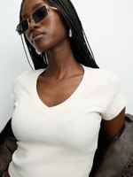 Elevate your wardrobe with The FIX's Milk Rib V-neck Top. This short-sleeved beauty features a flattering V-neck neckline and a cool ribbed fabric. Perfect for any occasion.