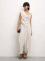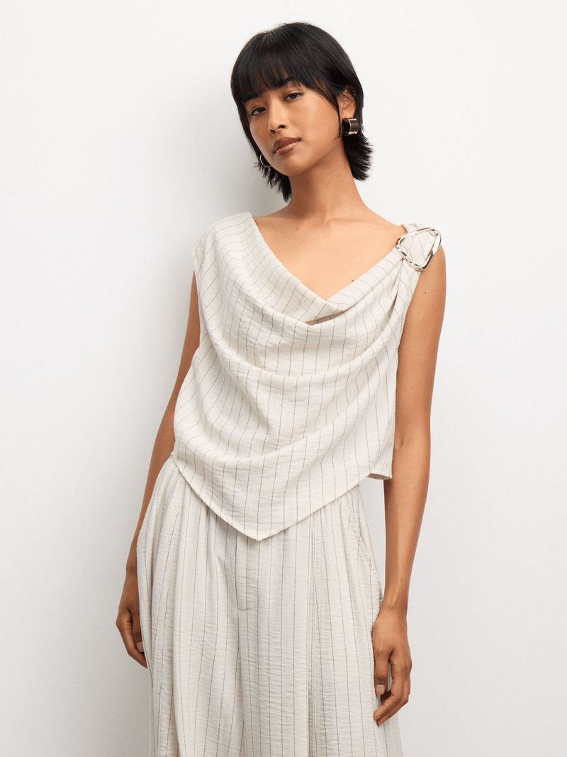 Introducing our cozy mocha stripe co-ord linen cowl top with hardware detail. This sleeveless top features a stylish cowl neckline. This top is perfect for effortless style and comfort. Elevate your wardrobe with this versatile piece.