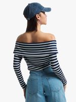Add this cute top to yo' new season drobe. Featuring a rib fabric, navy & white bardot design. Complete the look with your fav pants or cute mini for a look we loving.