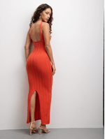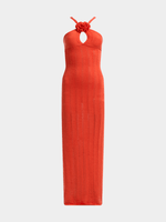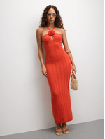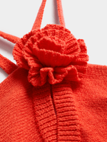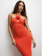 Brighten up any occasion in this bold orange halter dress, featuring delicate rosette accents and a flattering, body-hugging knit design. Made from soft 100% polyester, it’s perfect for summer parties, nights out, or standout moments.